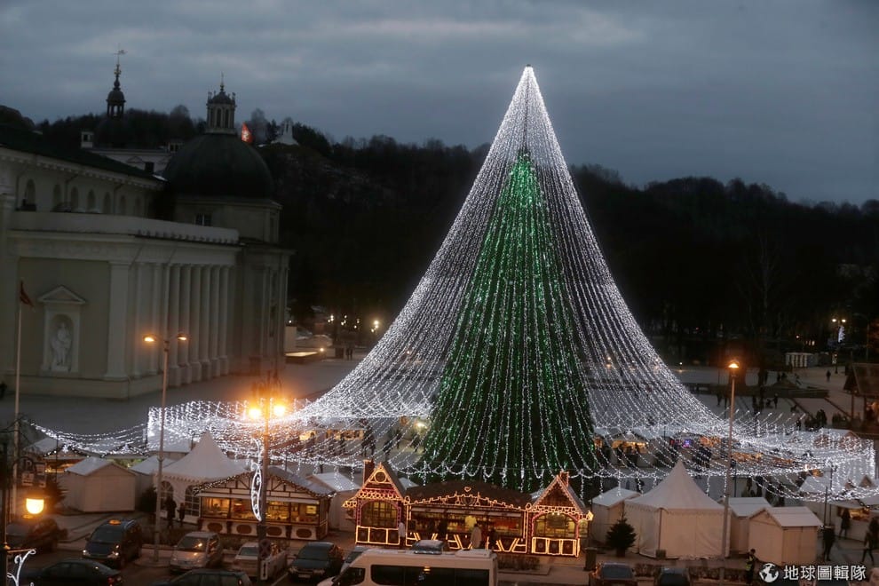 在首都維爾紐斯(Vilnius)市中心,一棵美麗的聖誕樹拔地而起,照亮了整個夜空。