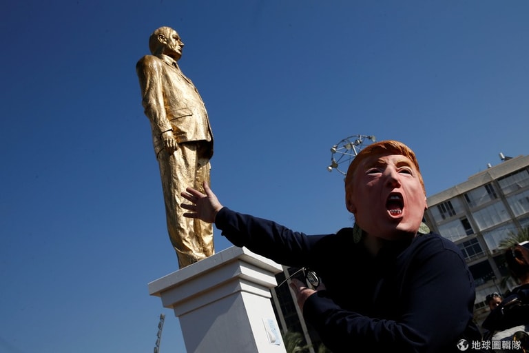 一名民眾戴上美國準總統川普(Donald Trump)的面具,指著位於特拉維夫(Tel Aviv)市政廳廣場的總理納坦亞虎(Benjamin Netanyahu)雕像,這座雕像外型金光閃閃,讓路過民眾都忍不住停下腳步見證總理的威風。
