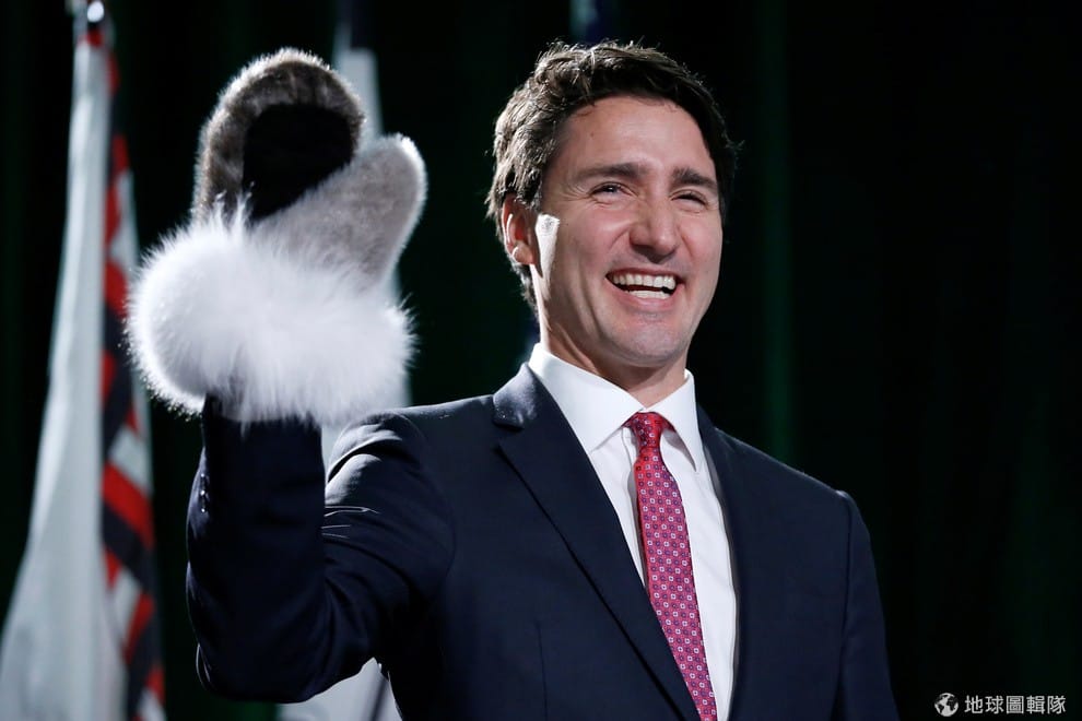 加拿大總理杜魯道(Justin Trudeau)在參加第一民族(First Nations)特別首長大會時,開心地用大會送他的原民傳統皮草手套打招呼。