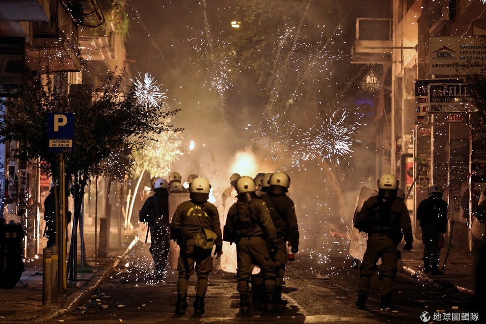 抗議人士在鎮暴警察前施放煙火,紀念在 2008年希臘動亂中遭警方擊斃的 15歲少年格里戈羅普洛斯(Alexandros Grigoropoulos)。