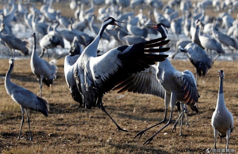 在以色列北部的胡拉(Hula)山谷自然保護區,成千上萬種的鳥類在遷徙途中都會在此停留,攝影師巧妙地捕捉到了兩隻鶴在相爭的畫面。