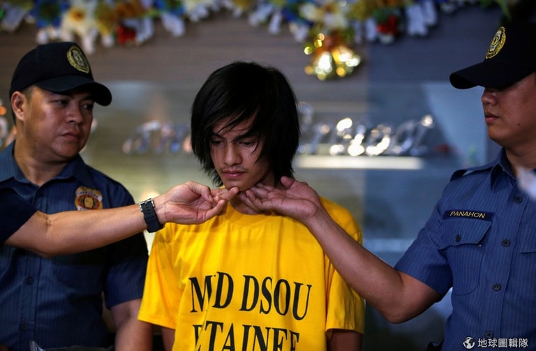 警方駕著 11月28日在美國駐菲大使館前放炸彈的嫌犯(黃衣者),來和媒體見面,貫徹總統杜特蒂(Rodrigo Duterte)絕不姑息犯罪的政策。