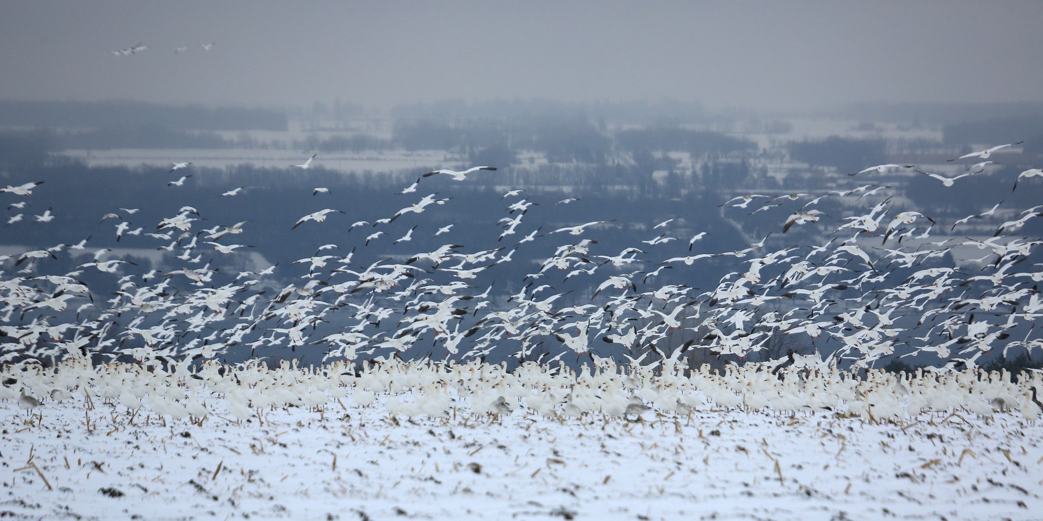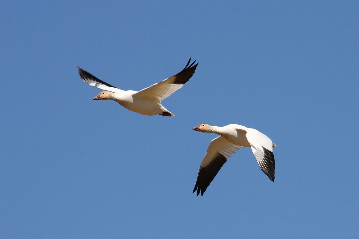 兩隻雪雁正在天上飛著。近日雪雁在蒙大拿州遷徙時發生意外,導致近萬支雪雁死亡。