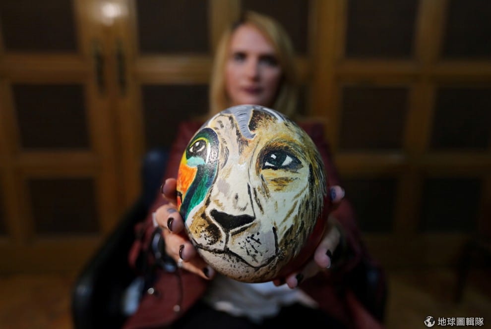 一名女子對著鏡頭秀出彩繪著獅子圖樣的鴕鳥蛋。