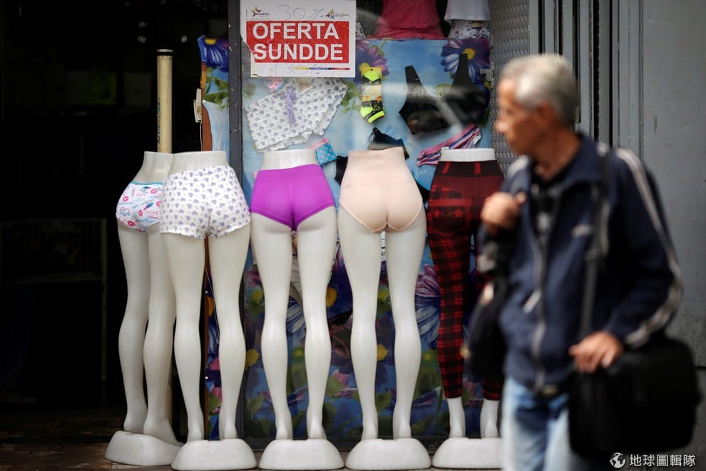 在經濟低迷的首都卡拉卡斯(Caracas),一名男子走過一間跳樓大拍賣的商店,其外站著一排展示各色內褲的假人。