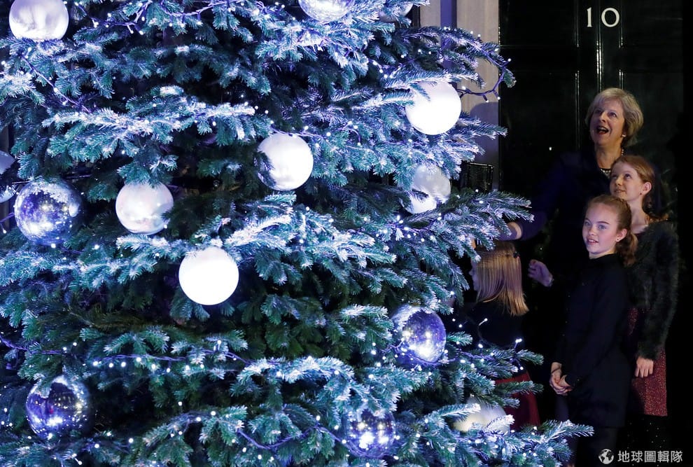 英國首相梅伊(Theresa May)看著唐寧街十號首相官邸前的聖誕樹,點燈的那一剎那讓她和民眾都開心地笑出來。