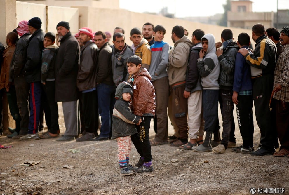 一對小兄妹在聯合國的物資發放處前,等待領取民生用品。這裡是摩蘇爾城(Mosul)東部,日前伊拉克軍隊成功擊退伊斯蘭國(IS),收復部分摩蘇爾城()領土,令人士氣大振。