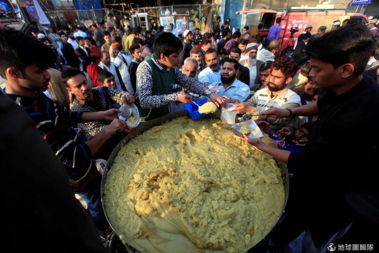 在慶祝伊斯蘭教先知穆罕默德(Muhammad)誕辰的聖紀節(Eid-e-Milad-ul-Nabi),民眾煮了一大鍋哈瓦爾酥糖( halwa),和身旁的教徒一起分享。