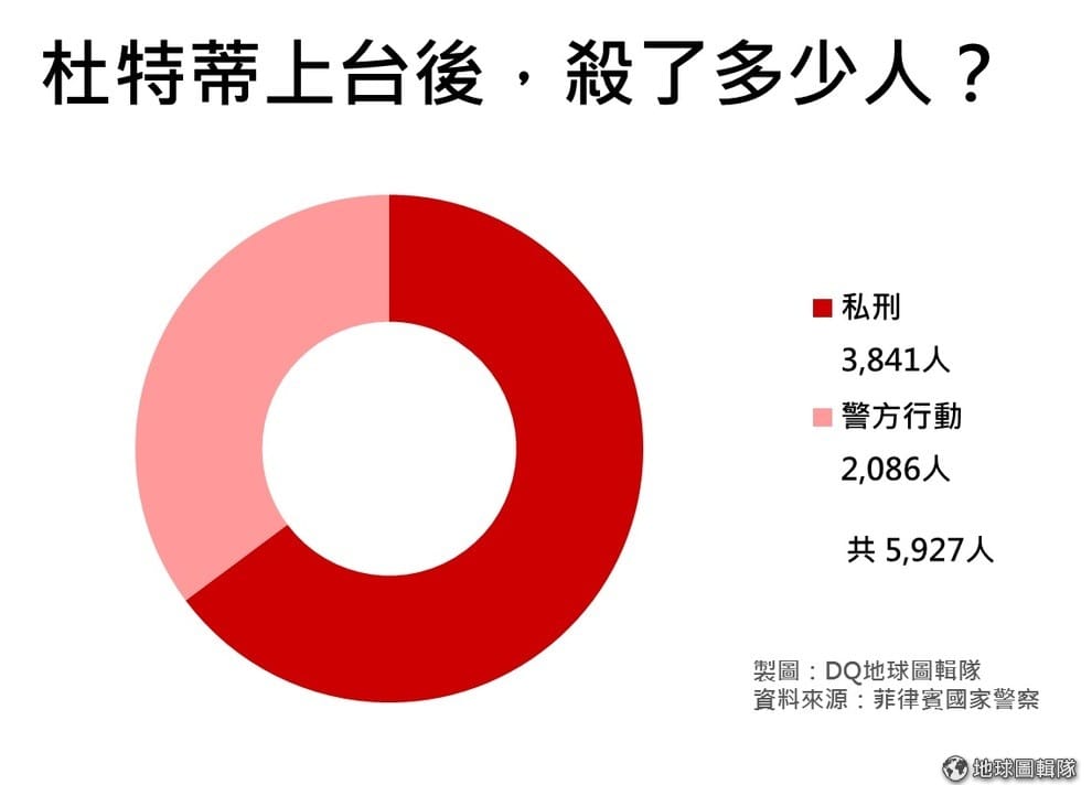 路透社上圖為杜特蒂上任後,總共有多少人死於警方行動和私刑中,人數已超過 5,000人。