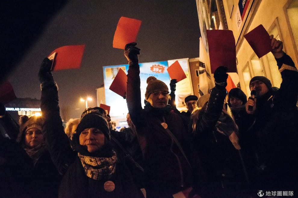 民眾齊聚執政黨法律與公正黨(Law and Justice Party)的黨部前,手拿紅牌判直政黨出局,大夥不滿執政黨箝制媒體,影響新聞自由決定站出來用行動表示。