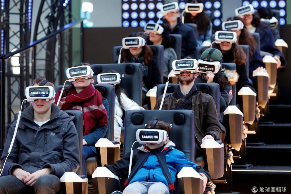 在巴黎大皇宮內,民眾正在享受三星(Samsung)電子舉辦的虛擬實境活動,他們頭戴虛擬實境眼鏡,觀賞在眼前栩栩如生的動畫。