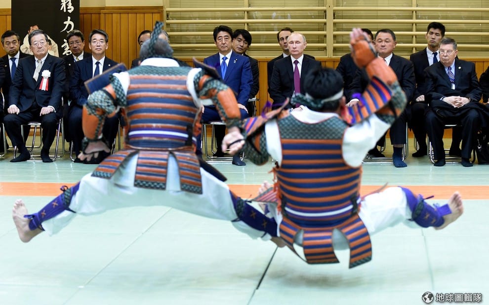 16號這天,日本首相安倍晉三(左四)帶著俄國總統普亭(Vladimir Putin,右三)來到位於東京的講道館,這裡是全球柔道的本部,館內的柔道好手也露了一手攻遠道而來的普亭欣賞,相傳他在大學時曾練過柔道,培養矯健的身手好進入情報局工作。
