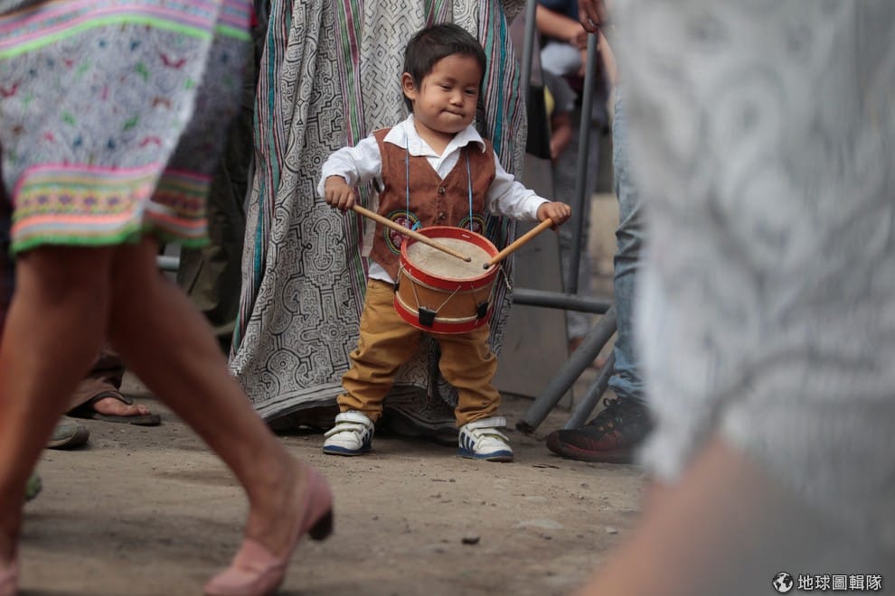 一名原民小男孩賣力地打著身前的鼓,準備歡迎祕魯總統庫琴斯基(Pedro Pablo Kuczynski)的到來。