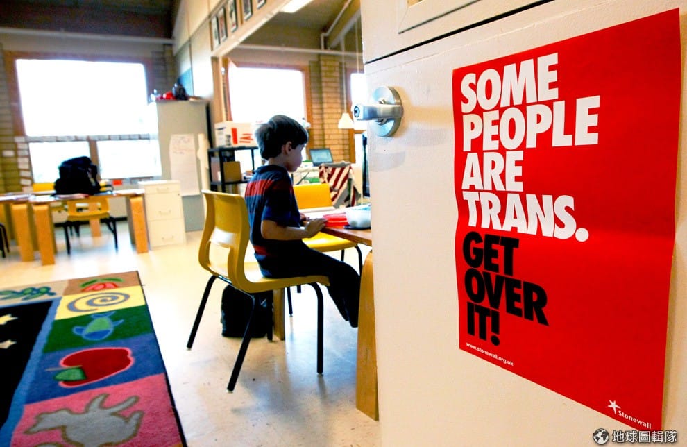 7歲的朗特曼(Zachary Lanterman)正在教室使用電腦,右方牆上的標語寫著:有些人就是跨性別者,克服他吧!
