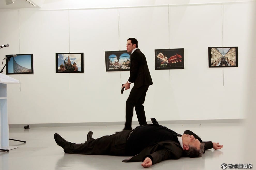 同樣在 19號晚上,俄國駐土耳其大使卡洛夫(Andrey Karlov)在安卡拉藝廊攝影展致詞時,在鏡頭前遭今年 22歲的土耳其警察阿登戴茲(Mevlut Mert Altintas)槍殺身亡。阿登戴茲在行兇後除了讚揚真主,還高喊要世人不要忘了敘利亞阿勒坡城。