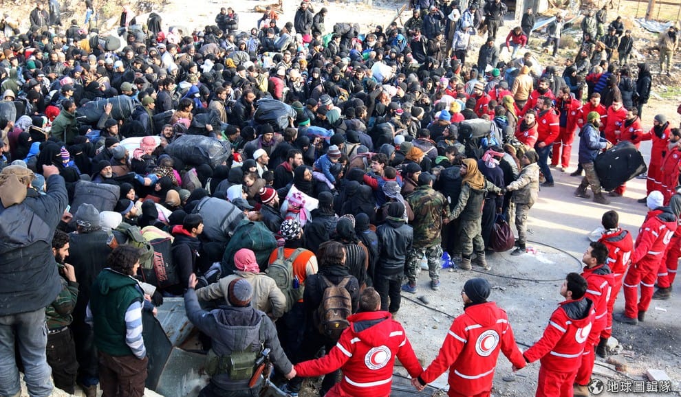 紅十字會與紅新月會國際聯合會(International Federation of Red Cross and Red Crescent Societies, IFRC)的成員手牽著手,保護準備撤離的東阿勒坡城人民與反政府軍。
