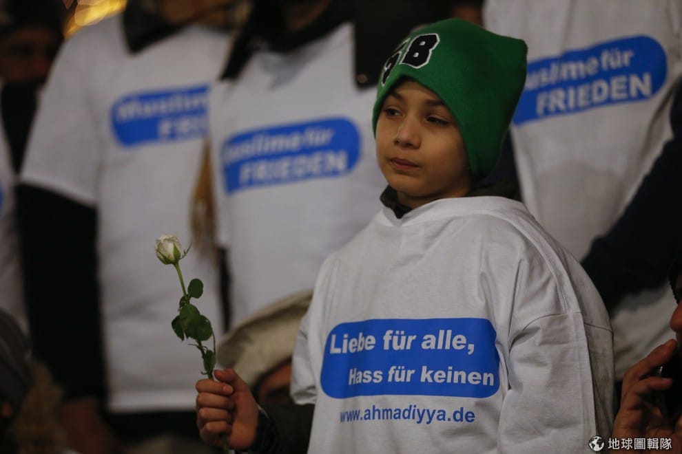 數名難民聚集到卡車蓄意衝撞聖誕市集的現場致哀,他們身上的衣服寫著:「愛所有人,憎恨沒有人」的標語。