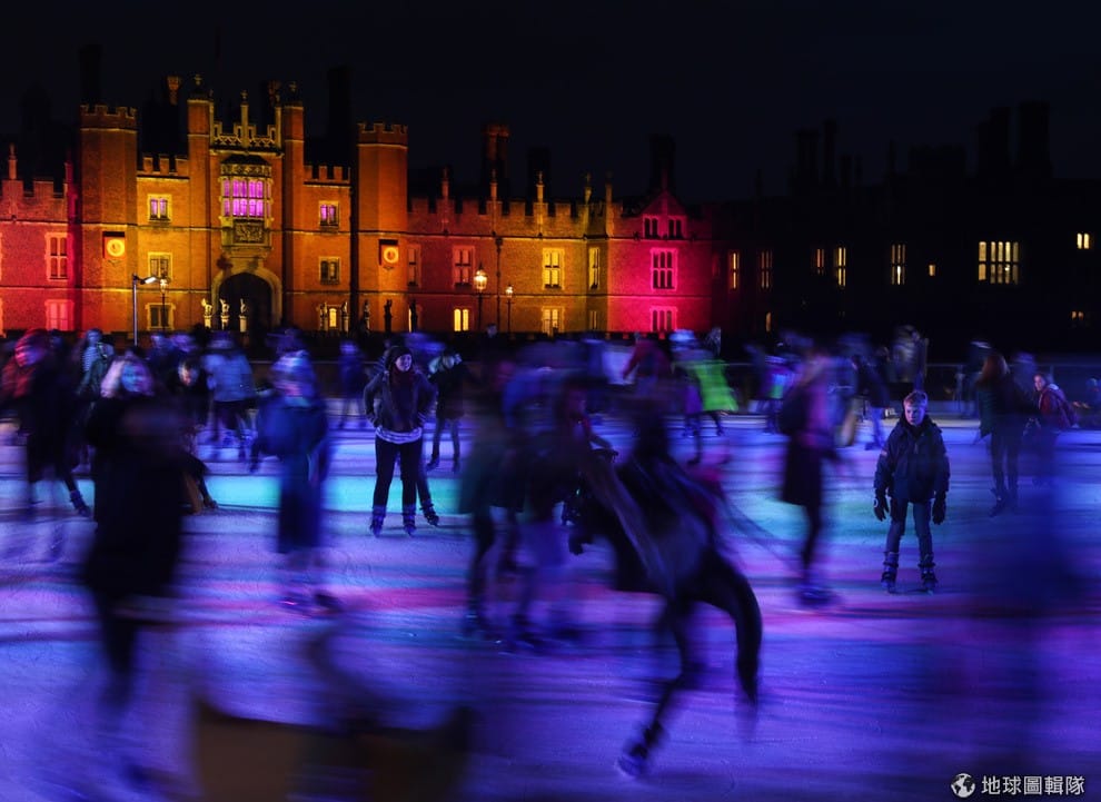 人們正在漢普敦宮(Hampton Court Palace)前溜冰。每到冬天,漢普敦宮前廣場就會搭建溜冰場供人玩樂。