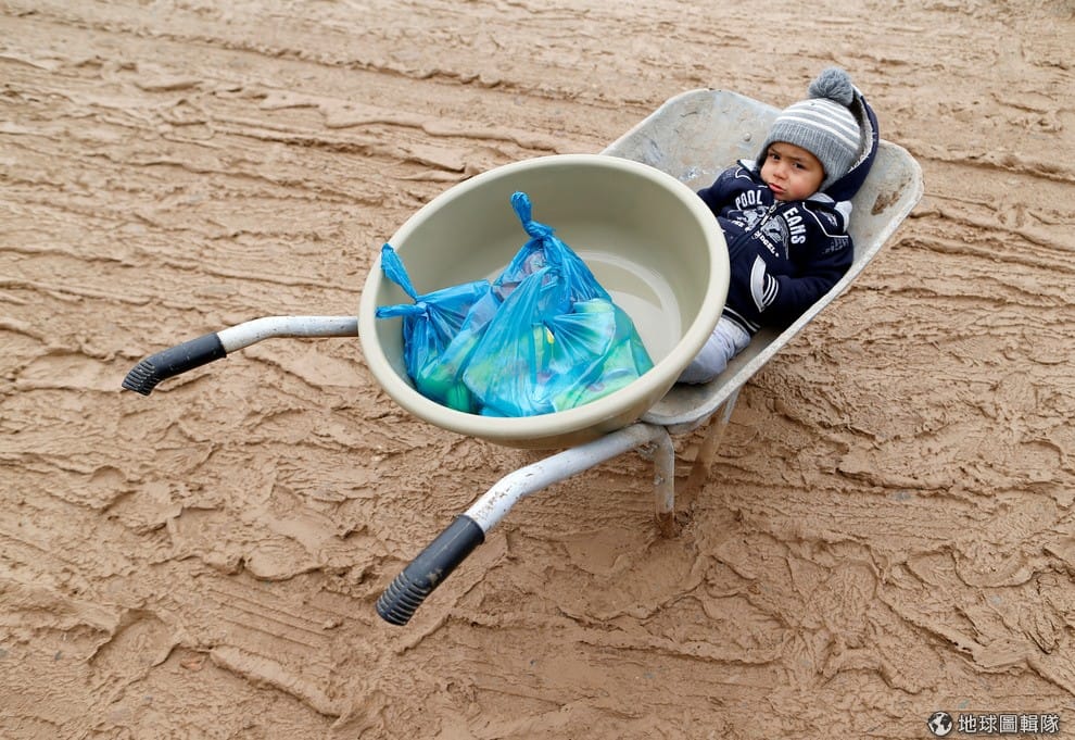 在卡札(Khazer)難民營,一名從摩蘇爾城(Mosul)逃出來的男孩躺在手推車裡看向鏡頭。