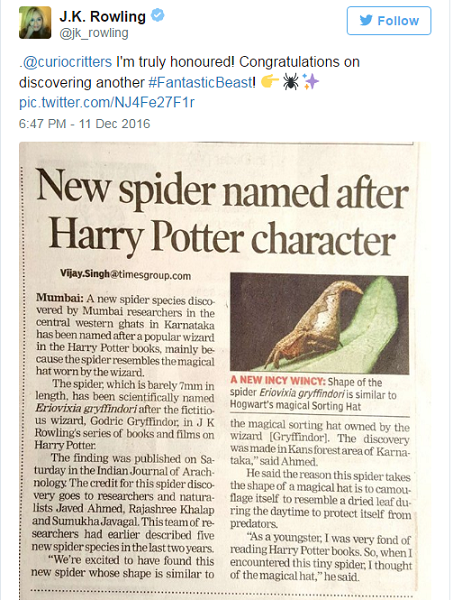 甚至連「哈利波特」的作者JK羅琳(J.K. Rowling)都在推特上PO 文表示開心:「我真的很榮幸!恭喜發現另一種奇獸!」