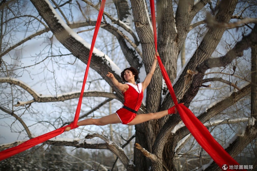 一名舞蹈者在大樹之間表演舞蹈,這裡是攝氏零下 37度的黑龍江省。