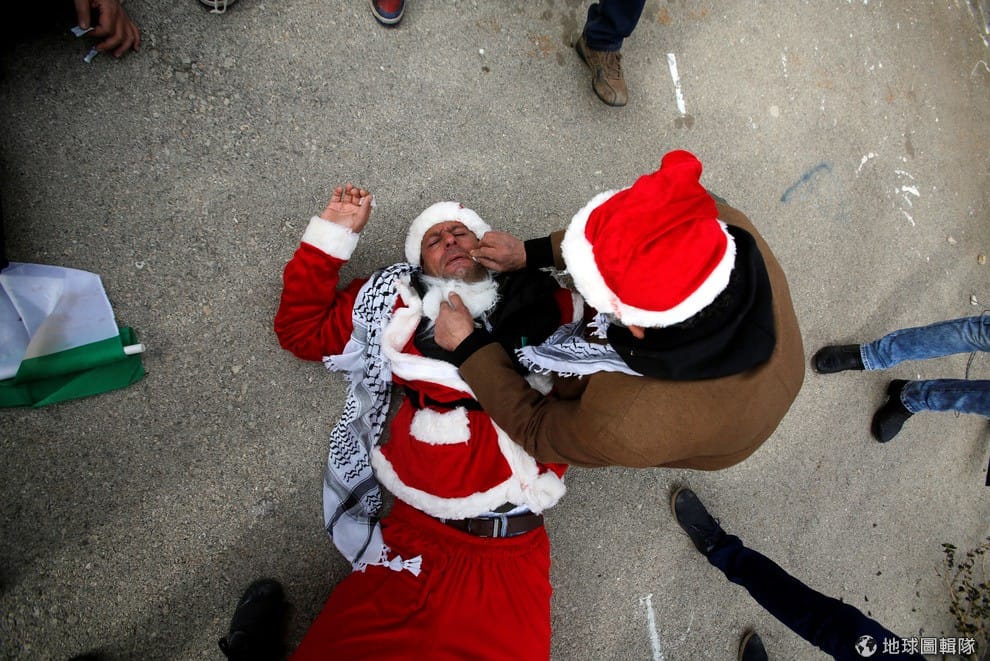 巴勒斯坦約旦河西岸的城市伯利恆(Bethlehem),一名打扮成聖誕老人的巴勒斯坦示威者,在與以色列軍隊的衝突中被催淚瓦斯波及。