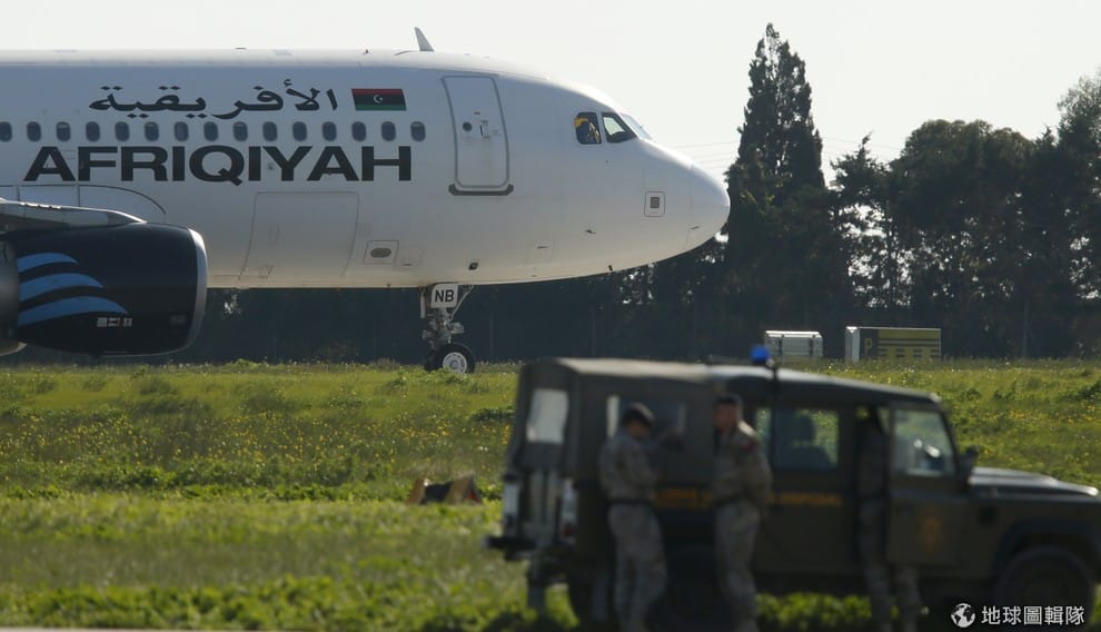 圖為馬爾他國際機場發生劫持事件的當下,飛機只能在機場上空盤旋下不來。