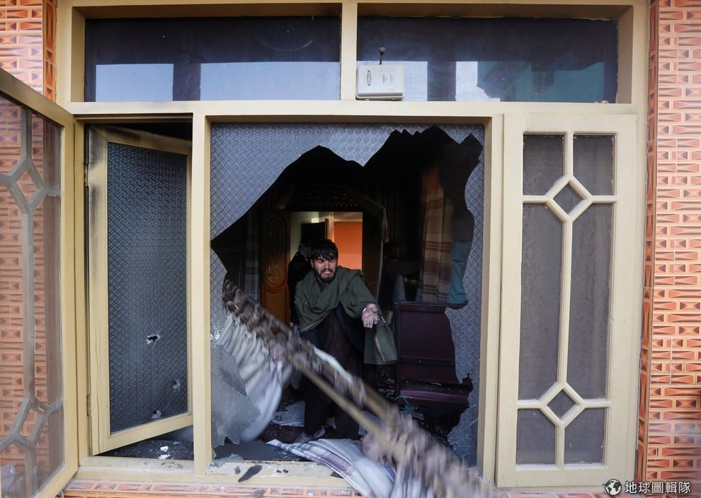 阿富汗議會遭到塔利班分子襲擊燒毀,在攻擊之後,一名男子奮力把窗戶碎片丟出外頭。