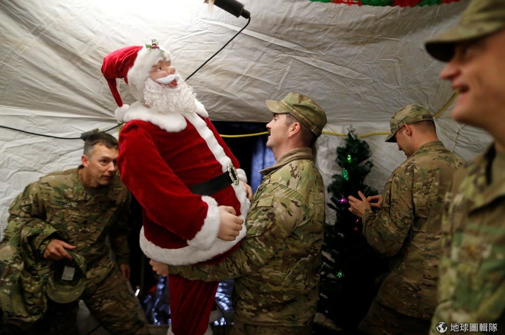 在伊拉克摩蘇爾城(Mosul)東部,美國大兵們在基地營擺好聖誕裝飾,準備享用聖誕晚餐。