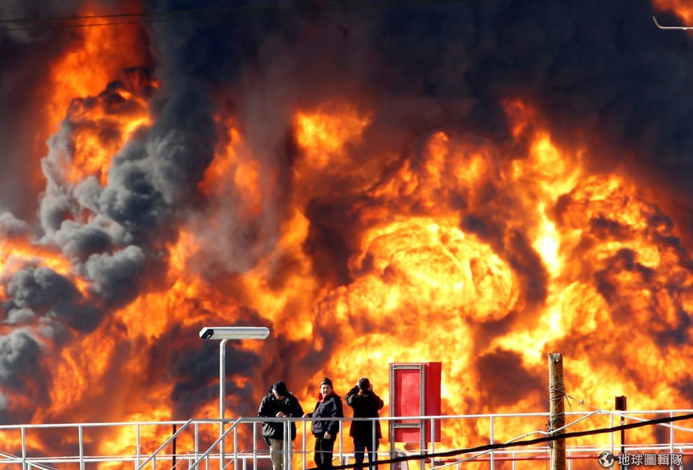 以色列一家煉油廠公司的油箱發生爆炸,照片中的人們站在天橋上觀看火勢。