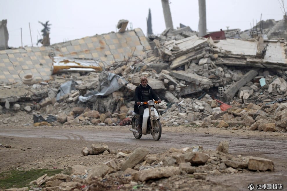 在敘利亞阿勒坡城北邊,一名男子騎著機車,經過因空襲而成為廢墟的建築物旁。