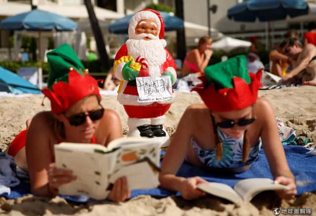 在美國夏威夷的威基基(Waikiki)海灘,兩名帶著聖誕精靈帽子的海灘客在後方擺著一尊聖誕老人。