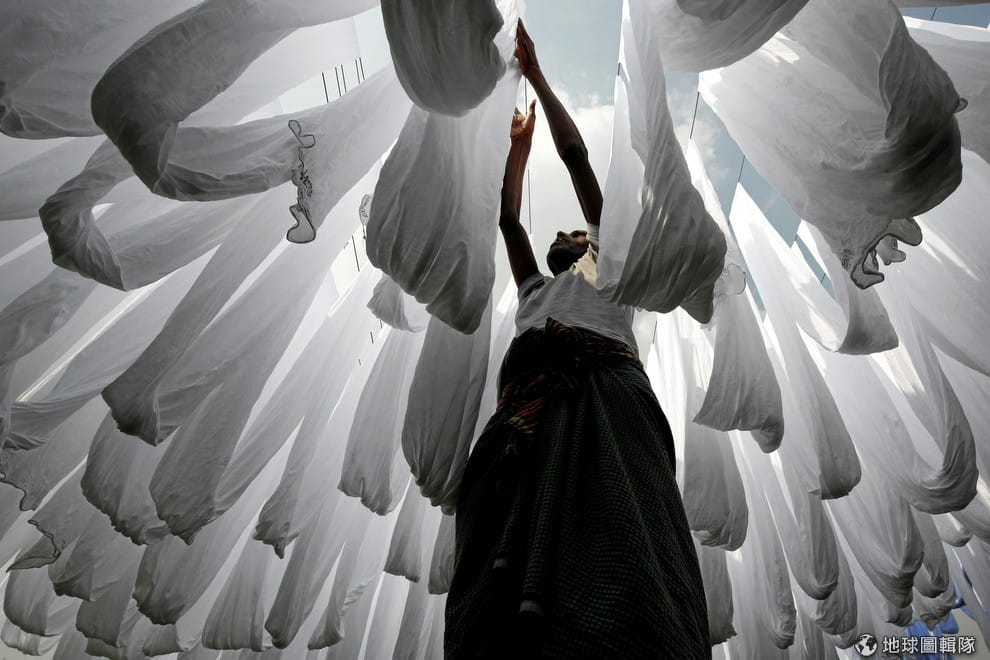 在達卡(Dhaka)的染布工廠,一名工人忙著將布料曬乾。