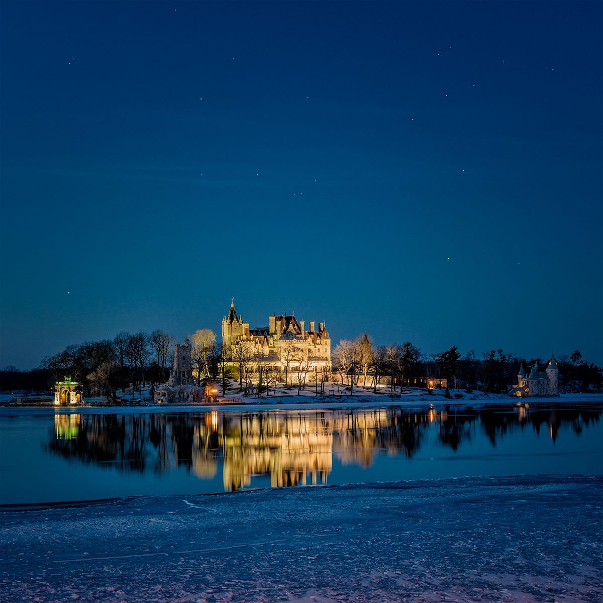 堡主博爾特死後,把心島和博爾特城堡都送給了美國政府,讓該地成了民眾前往千島湖地區旅遊的必經之地。圖為夜幕降臨時打上光的博爾特城堡。