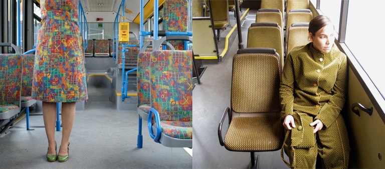 「透過我的介入,乘客開始意識到『看不到』的布料。」史蒂文森訂購了一批座椅布,用座椅布做出一件件衣服後,讓模特兒穿上融入到大眾交通工具上。