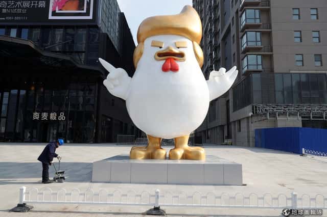 中國山西省太原的百貨公司,在廣場前擺了座美國準總統川普(Donald Trump)造型的公雞雕像。