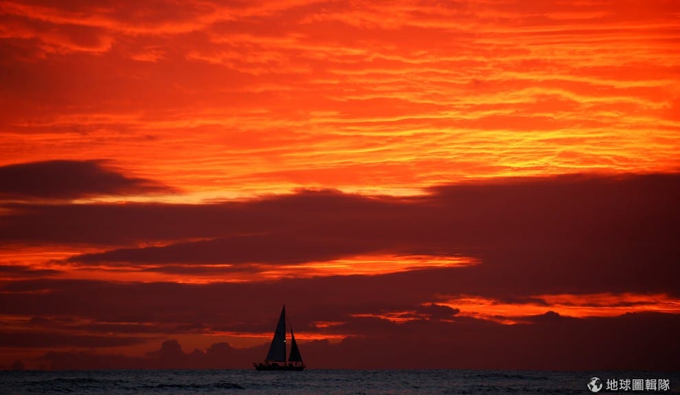 在夏威夷,一艘帆船身後映著紅澄澄的夕陽美景,緩緩地航行在海上,準備向 2016年說再見。