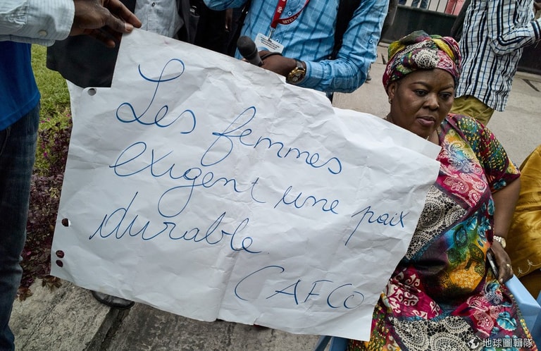 31號這天,剛果全國主教會議外,來了一群靜坐抗議人士。其中,一名女子手上舉著寫有「女性需要穩定和平」字樣的海報,要求執政者卡比拉總統( Joseph Kabila )和在野黨可以好好協商,不要再製造衝突。