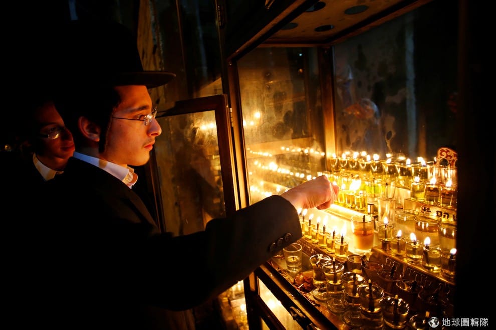 一名猶太正教男子專心地點燃手中的蠟燭,31號是猶太傳統節日「光明節」(Hanukkah)的最後一天。