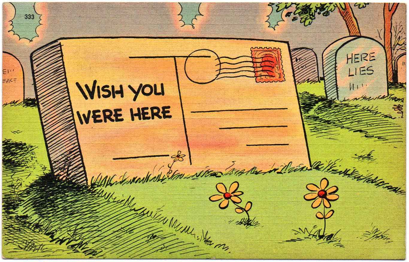 畫家將墓碑以明信片的方式呈現,並在上面寫到:「希望你也在這裡。」表達出人將離世的不捨心情。