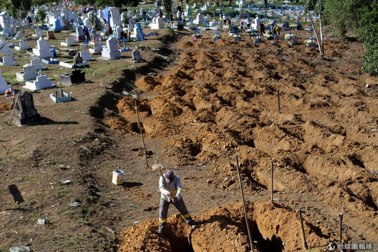一名工人在墓園挖出一個個土坑,準備為近日在巴西監獄暴動中身亡的受刑人下葬。