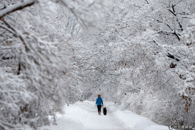 一名女子在銀白世界中遛狗,再往旁邊一點就是渥太華著名景點麗都運河(Rideau Canal)。