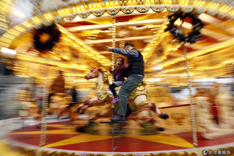 在倫敦自然歷史博物館外,民眾開心地享受玩旋轉木馬的樂趣。