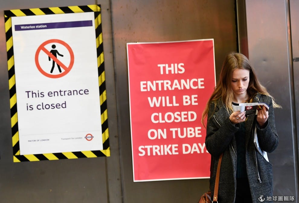 一名女子站在關閉的倫敦地鐵站旁。為了抗議當局縮減售票處還有精簡人事開銷,地鐵工會發起罷工,要用行動要求當局提供更好的勞動條件。