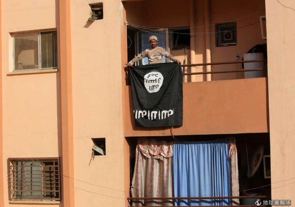 在伊拉克軍隊和伊斯蘭國(IS)短兵相接的摩蘇爾城(Mosul)北部,一名伊拉克軍人拿著伊斯蘭國棄置在建物中的黑色旗幟。目前伊斯蘭國節節敗退,伊拉克當局已收復部分失土。