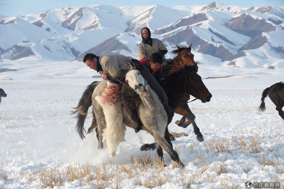 在新疆維吾爾自治區,男子們騎著馬在雪地上來一場布茲卡茲比賽(Buzkashi game),這種比賽又稱為「叼羊」。根據《維基百科》的資料,叼羊比賽會把選手分為兩隊,每隊 10人,限選手們在一小時內於馬背上爭奪一頭小牛或小羊的屍體,獲勝一方有賞,最後參賽者也會把小羊吃下肚象徵獲得幸運。