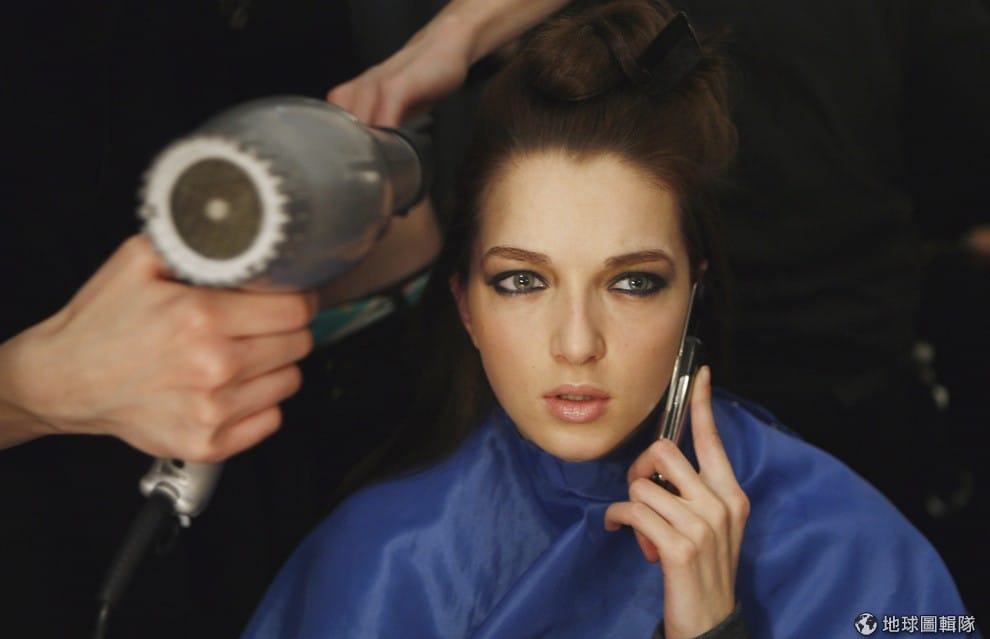 一名模特兒一邊梳妝一邊講電話,現在這種滑蓋式手機也不多見了。