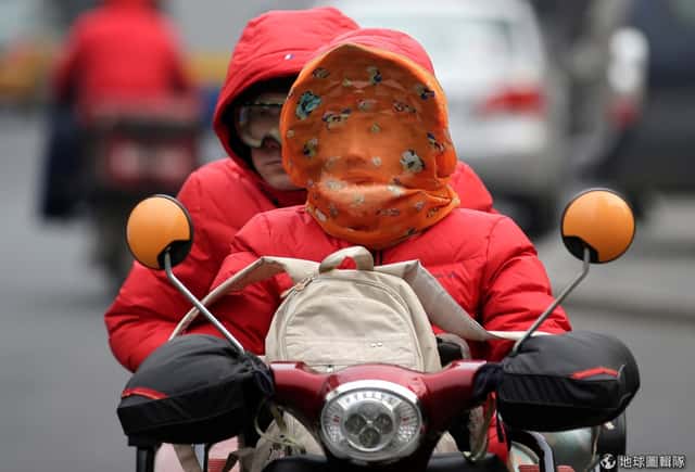 一名女子用絲巾把全臉包住,在冷颼颼的北京街頭騎車。