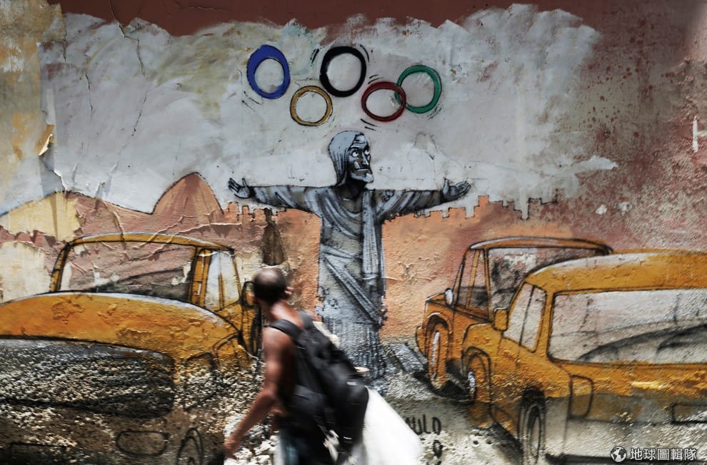 一名男子走過一幅街頭塗鴉,塗鴉上描繪著里約熱內盧基督像把奧運五環當作雜耍圈玩耍的模樣。這幅塗鴉是由巴西街頭藝術家伊東(Paulo Ito)所繪,伊東先前以一幅「巴西小孩只能把足球當飯吃」的反世界杯塗鴉而廣為人知。