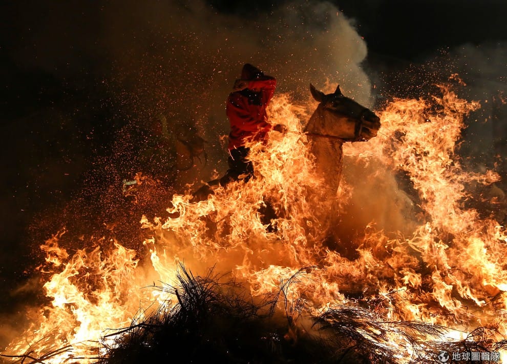 一名男子騎著馬跳過火焰。這一天是燈籠節(Luminarias),也就是西班牙聖安東尼節(Saint Anthony's)的前一天。
